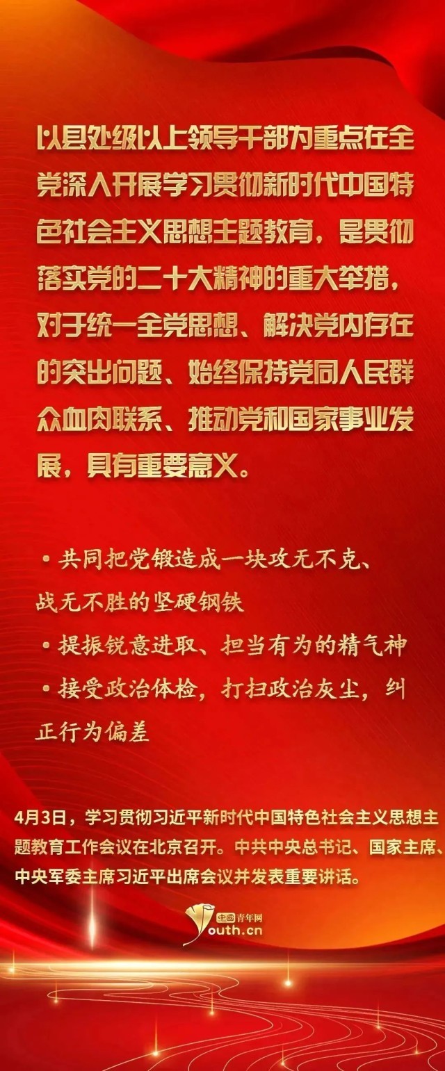 4月3日,學(xué)習(xí)貫徹習(xí)近平新時(shí)代中國(guó)特色社會(huì)主義思想主題教育工作會(huì)議在北京召開(kāi)。中共中央總書(shū)記、國(guó)家主席、中央軍委主席習(xí)近平出席會(huì)議并發(fā)表重要講話(huà)。