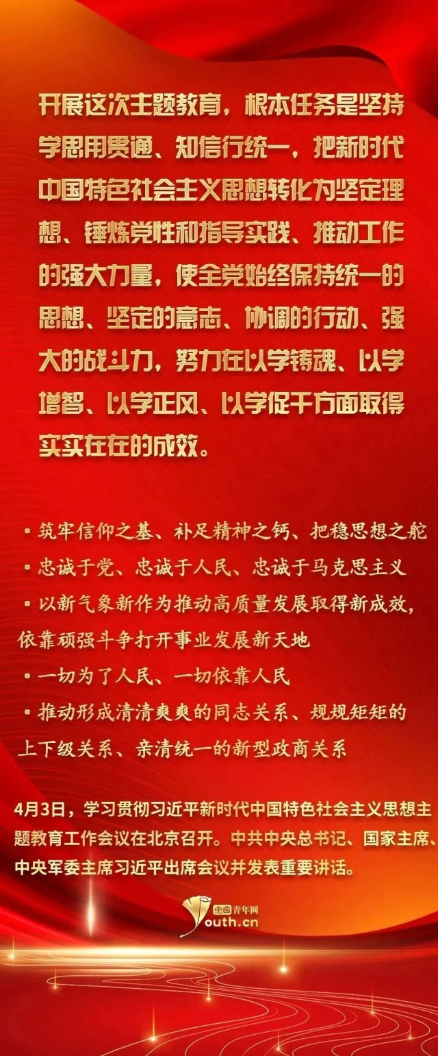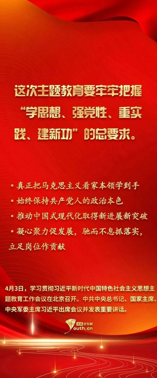 習(xí)近平新時(shí)代中國(guó)特色社會(huì)主義思想實(shí)現(xiàn)了馬克思主義中國(guó)化新的飛躍。此次開(kāi)展學(xué)習(xí)貫徹習(xí)近平新時(shí)代中國(guó)特色社會(huì)主義思想主題教育,是一件事關(guān)全局的大事。廣大青年要以這次主題教育為契機(jī),用黨的科學(xué)理論武裝頭腦,在學(xué)習(xí)習(xí)近平新時(shí)代中國(guó)特色社會(huì)主義思想中不斷筑牢信仰之基、補(bǔ)足精神之鈣、把穩(wěn)思想之舵。