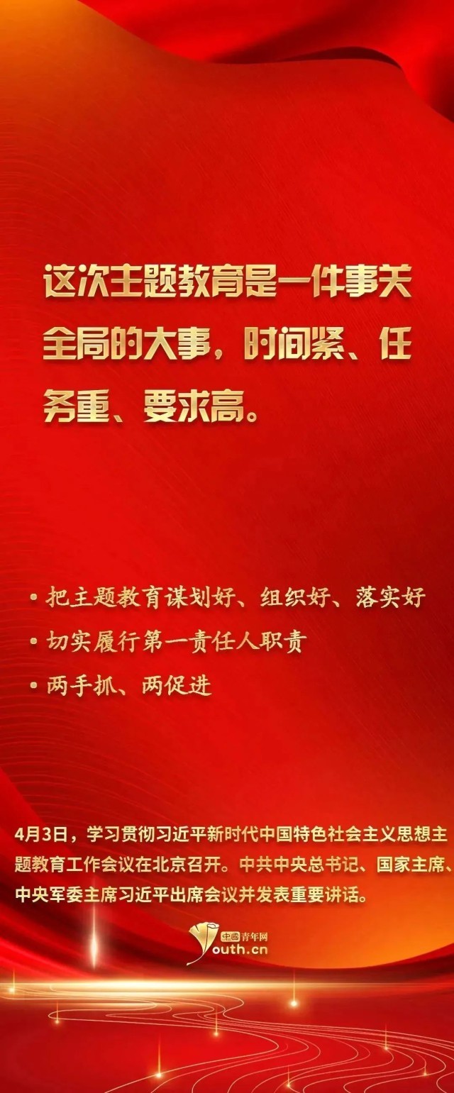 主講人:青年朋友們大家好,我是來(lái)自北京青年政治學(xué)院馬克思主義學(xué)院的周穎老師。4月3日,在學(xué)習(xí)貫徹習(xí)近平新時(shí)代中國(guó)特色社會(huì)主義思想主題教育工作會(huì)議上,習(xí)近平總書(shū)記指出,這次主題教育是一件事關(guān)全局的大事,時(shí)間緊、任務(wù)重、要求高。