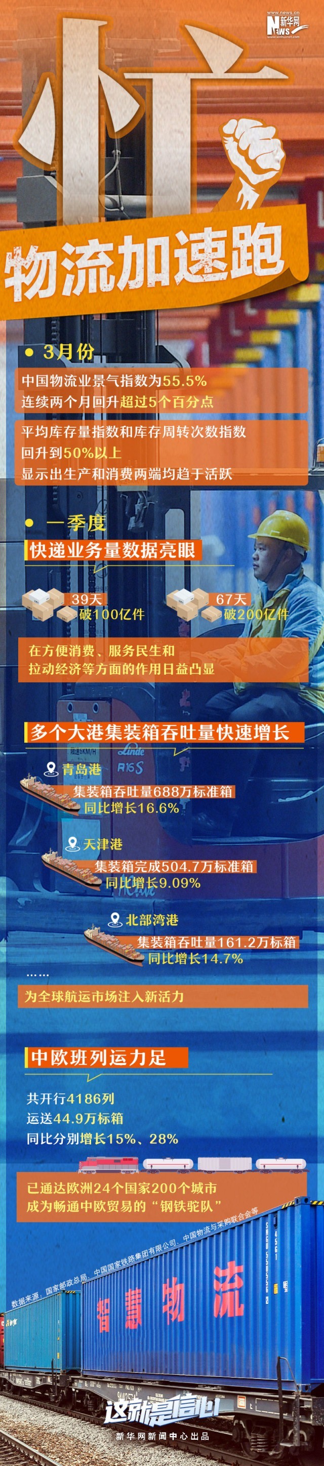 物流是國(guó)民經(jīng)濟(jì)運(yùn)行的血脈。1-3月,快遞業(yè)務(wù)、中歐班列、集裝箱吞吐量等多個(gè)維度的物流數(shù)據(jù)持續(xù)向好,共同交織出了繁忙中國(guó)的經(jīng)濟(jì)加速度。