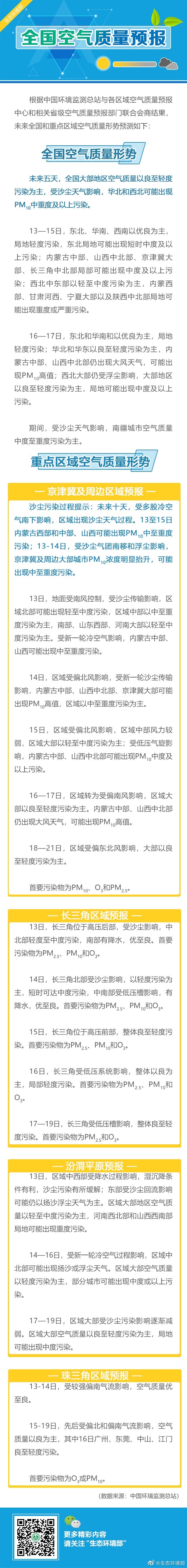 央視網(wǎng)消息:據(jù)@生態(tài)環(huán)境部 微博消息,未來(lái)五天(4月13—17日),全國(guó)大部地區(qū)空氣質(zhì)量以良至輕度污染為主,受沙塵天氣影響,華北和西北可能出現(xiàn)PM10中重度及以上污染。