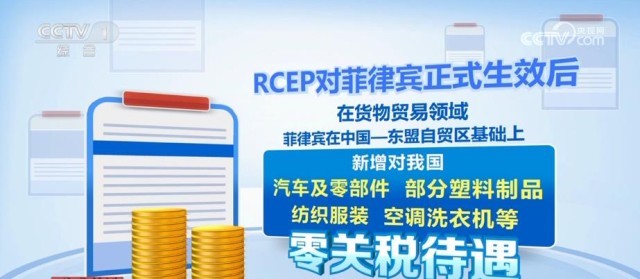 據(jù)了解,我國是菲律賓最大貿易伙伴、第一大進口來源地和第三大出口市場。RCEP對菲律賓正式生效后,在貨物貿易領域,菲律賓在中國—東盟自貿區(qū)基礎上,新增對我國汽車及零部件、部分塑料制品、紡織服裝、空調洗衣機等,零關稅待遇。