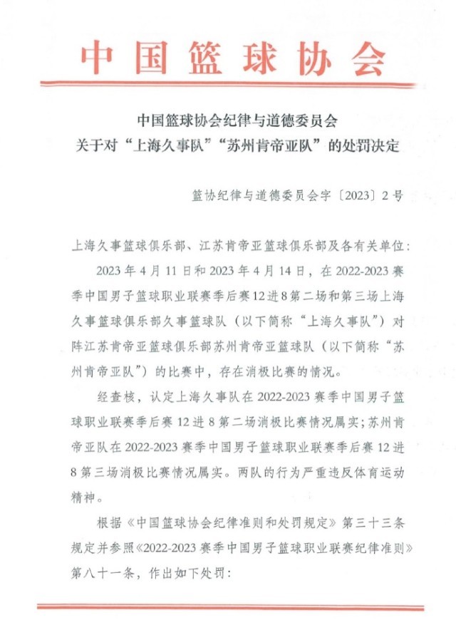 央視網(wǎng)消息:據(jù)@中國籃球協(xié)會(huì) 微博消息,4月17日,中國籃球協(xié)會(huì)紀(jì)律與道德委員會(huì)公布關(guān)于對(duì)“上海久事隊(duì)”“蘇州肯帝亞隊(duì)”的處罰決定。