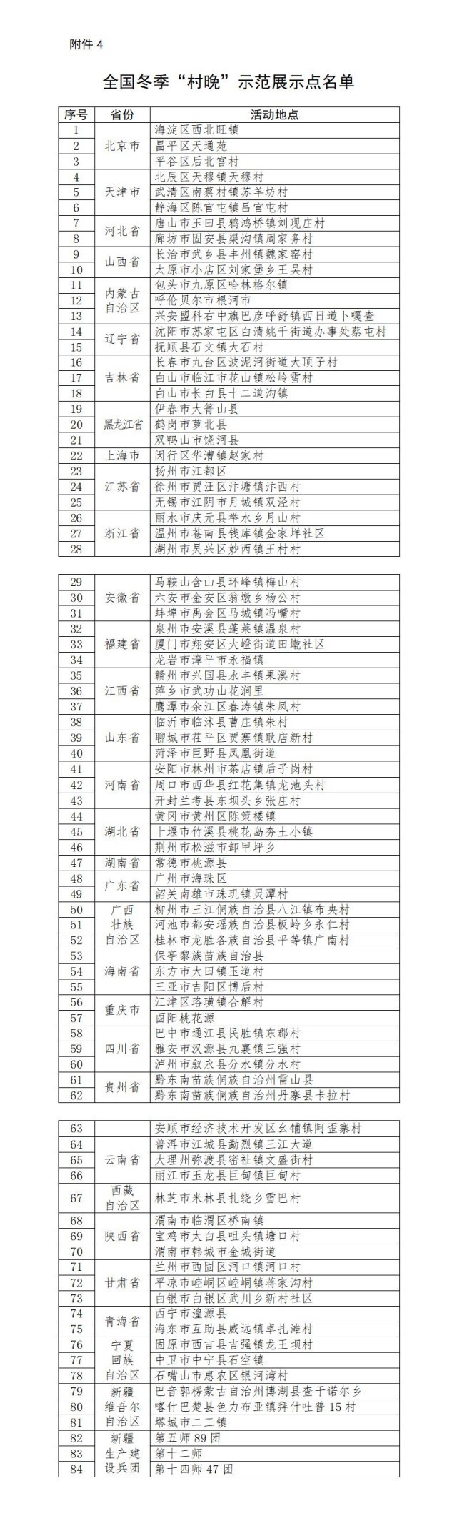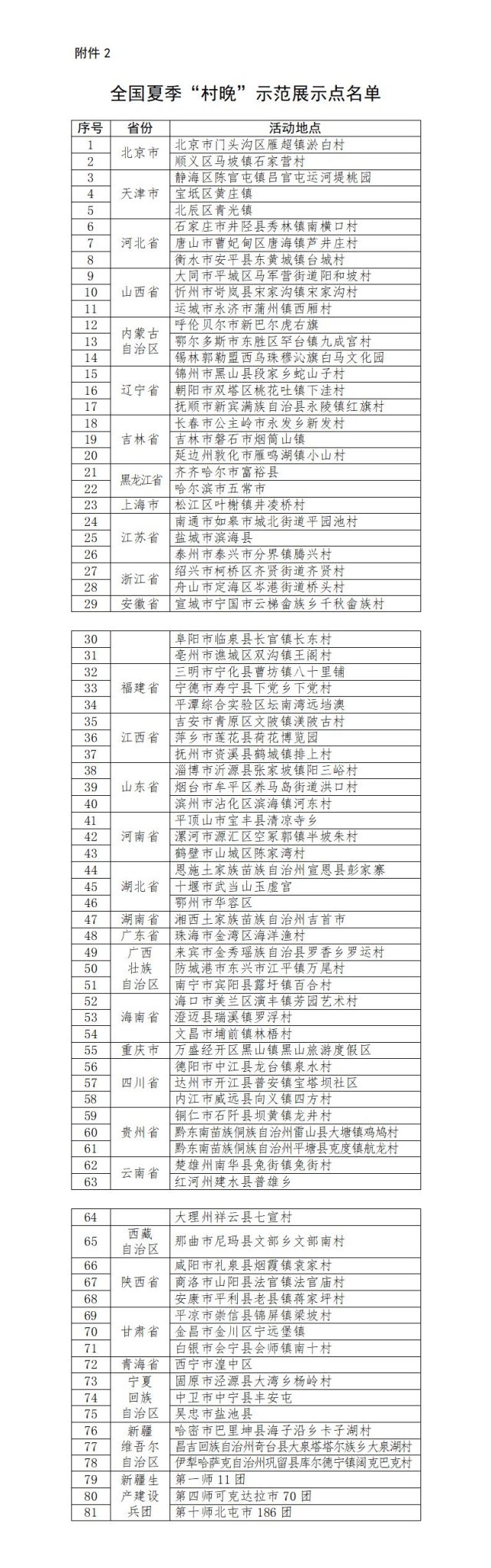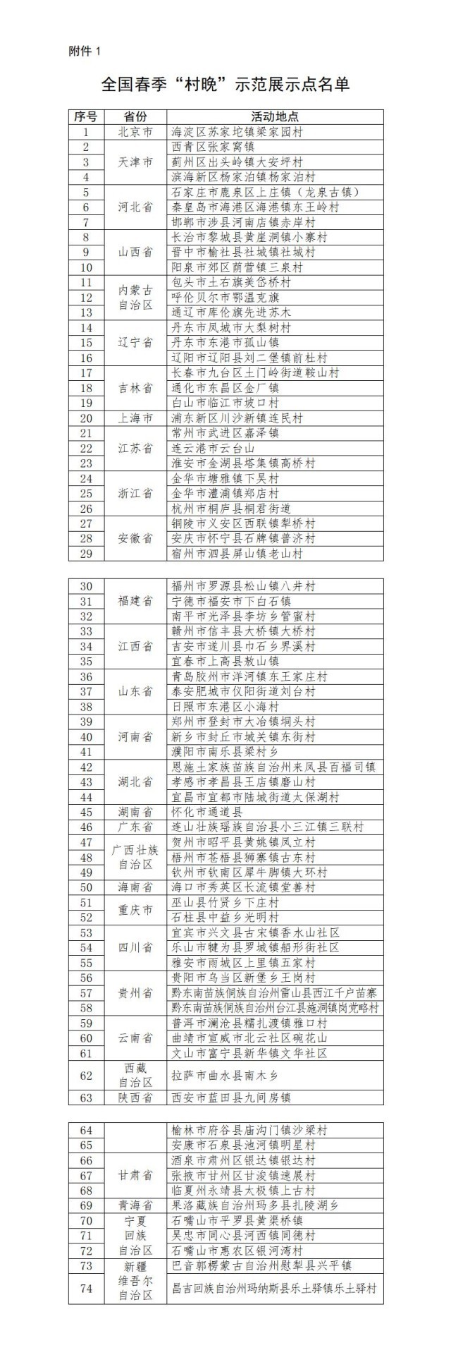 央視網(wǎng)消息:據(jù)文化和旅游部網(wǎng)站消息,根據(jù)《文化和旅游部辦公廳關(guān)于開展“四季村晚”活動(dòng)的通知》(辦公共發(fā)〔2023〕52號(hào))要求,文化和旅游部公共服務(wù)司在各省級(jí)文化和旅游行政部門申報(bào)推薦的基礎(chǔ)上,經(jīng)研究,確定春季“村晚”主會(huì)場設(shè)在四川省宜賓市、夏季“村晚”主會(huì)場設(shè)在云南省麗江市、秋季“村晚”主會(huì)場設(shè)在江西省九江市、冬季“村晚”主會(huì)場設(shè)在浙江省麗水市、廣西壯族自治區(qū)柳州市,并確定了“四季村晚”示范展示點(diǎn)名單,現(xiàn)予以公布。