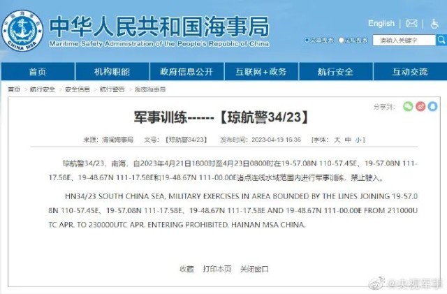 據(jù)中國(guó)海事局網(wǎng)站消息,清瀾海事局發(fā)布航行警告,自4月21日18時(shí)至4月23日8時(shí),南海部分海域進(jìn)行軍事訓(xùn)練,禁止駛?cè)搿?/p>