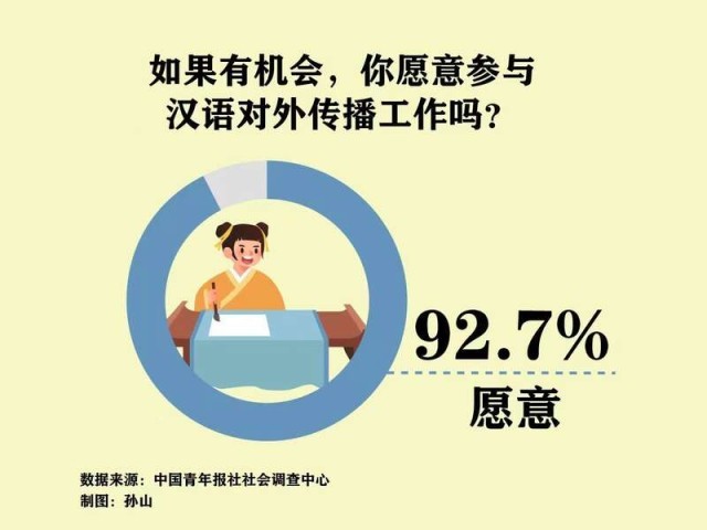 在4月20日聯(lián)合國(guó)中文日到來(lái)之際,中國(guó)青年報(bào)社社會(huì)調(diào)查中心聯(lián)合問(wèn)卷網(wǎng)(wenjuan.com),對(duì)2002名受訪青年進(jìn)行的一項(xiàng)調(diào)查顯示,81.6%的受訪青年認(rèn)為漢語(yǔ)熱下,對(duì)外漢語(yǔ)工作者的需求量會(huì)增加。92.7%的受訪青年明確表示如果有機(jī)會(huì),愿意參與漢語(yǔ)對(duì)外傳播工作。