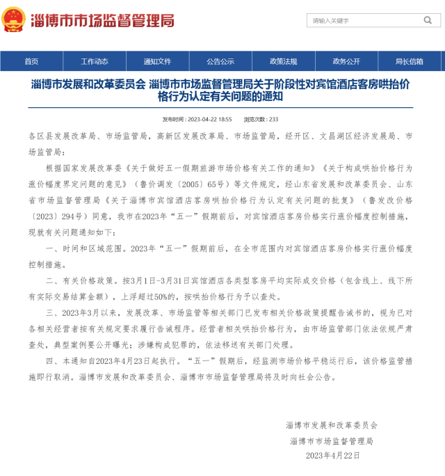 央視網消息:4月22日,淄博市發(fā)展和改革委員會、淄博市市場監(jiān)督管理局聯(lián)合發(fā)布《關于階段性對賓館酒店客房哄抬價格行為認定有關問題的通知》(以下簡稱《通知》)?!锻ㄖ访鞔_,2023年“五一”假期前后,在全市范圍內對賓館酒店客房價格實行漲價幅度控制措施。按3月1日至3月31日賓館酒店各類型客房平均實際成交價格(包含線上、線下所有實際交易結算金額),上浮超過50%的,按哄抬價格行為予以查處。通知全文如下: