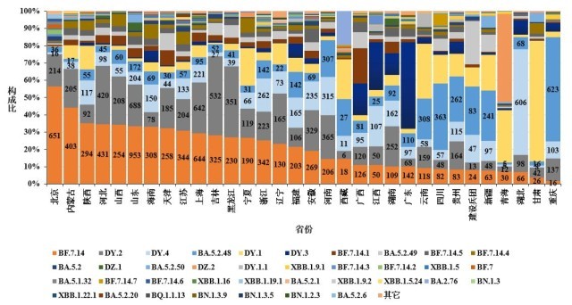 ?。ㄈ┬鹿诓《咀儺惙质》萸闆r??傮w來(lái)看,北京和內(nèi)蒙古以BF.7及其亞分支為優(yōu)勢(shì)株;海南、山西和天津兩簇進(jìn)化分支基本持平;其它省份均以BA.5.2及其亞分支為優(yōu)勢(shì)株(圖4-2)。