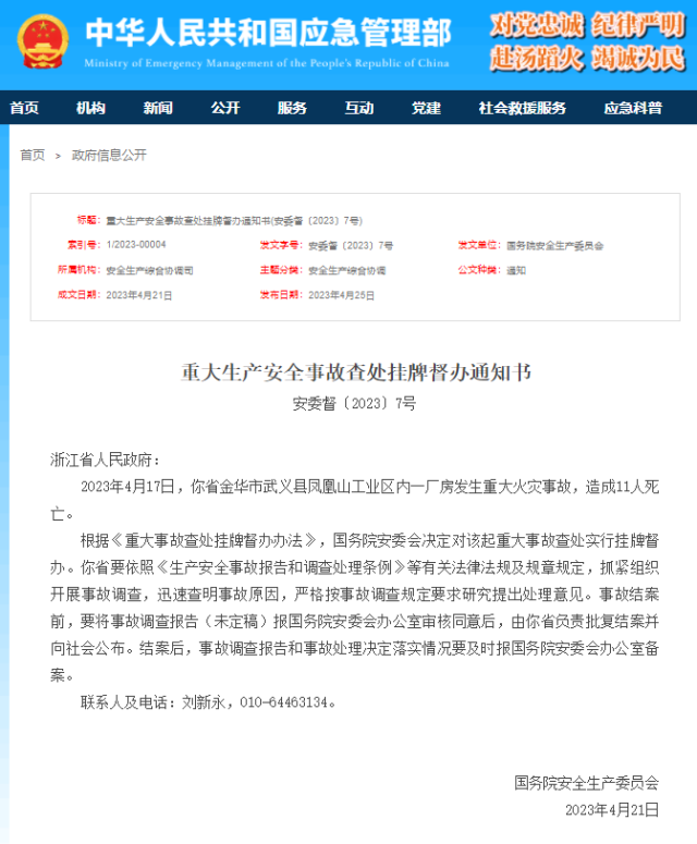 國務(wù)院安委會決定對浙江金華一廠房重大火災(zāi)事故查處實行掛牌督辦