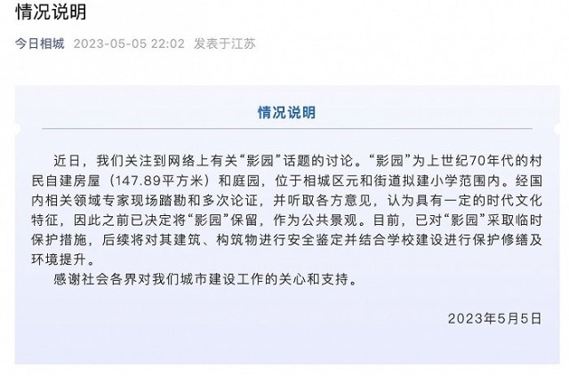 央視網(wǎng)消息:蘇州相城區(qū)委宣傳部公眾號“今日相城”5月5日發(fā)布情況說明稱,近日關(guān)注到網(wǎng)絡(luò)上有關(guān)“影園”話題的討論。“影園”為上世紀(jì)70年代的村民自建房屋(147.89平方米)和庭園,位于相城區(qū)元和街道擬建小學(xué)范圍內(nèi)。經(jīng)國內(nèi)相關(guān)領(lǐng)域?qū)<椰F(xiàn)場踏勘和多次論證,并聽取各方意見,認(rèn)為具有一定的時(shí)代文化特征,因此之前已決定將“影園”保留,作為公共景觀。目前,已對“影園”采取臨時(shí)保護(hù)措施,后續(xù)將對其建筑、構(gòu)筑物進(jìn)行安全鑒定并結(jié)合學(xué)校建設(shè)進(jìn)行保護(hù)修繕及環(huán)境提升。