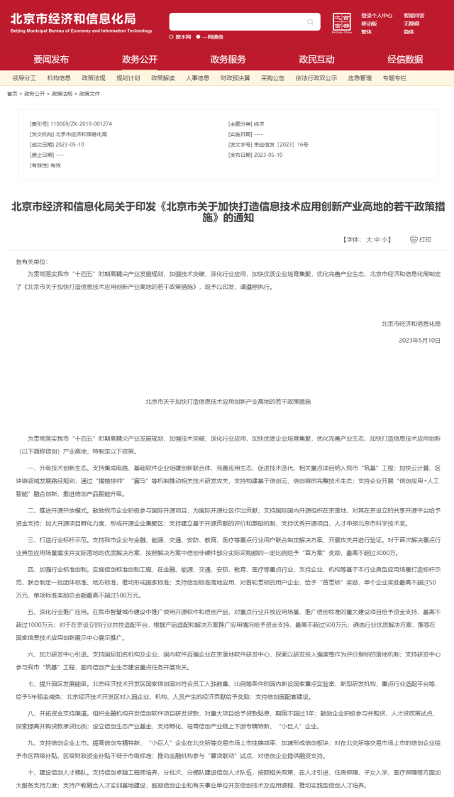 《北京市關(guān)于加快打造信息技術(shù)應(yīng)用創(chuàng)新產(chǎn)業(yè)高地的若干政策措施》印發(fā)