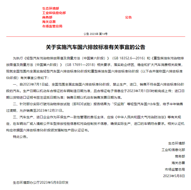 工信部等5部門(mén)發(fā)布公告:自2023年7月1日起,全國(guó)范圍全面實(shí)施國(guó)六排放標(biāo)準(zhǔn)6b階段,禁止生產(chǎn)、進(jìn)口、銷(xiāo)售不符合國(guó)六排放標(biāo)準(zhǔn)6b階段的汽車(chē)。