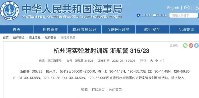 浙江海事局發(fā)布航行警告:杭州灣部分水域進(jìn)行實(shí)彈發(fā)射訓(xùn)練