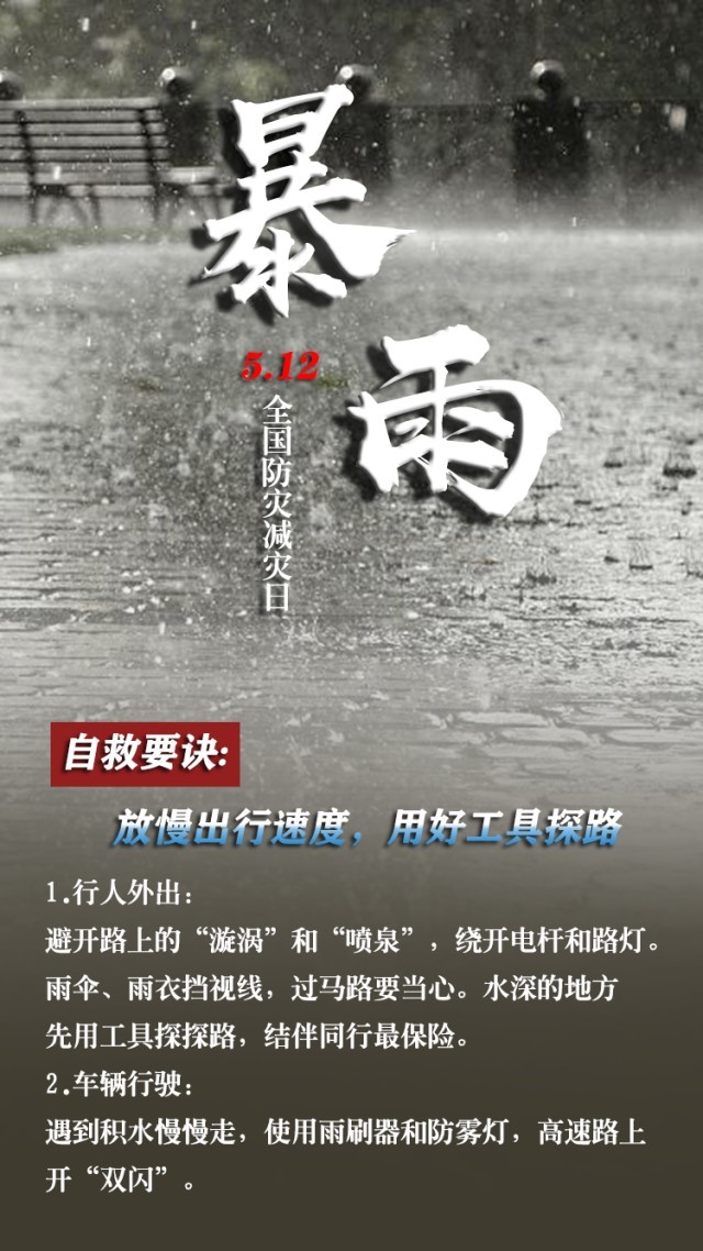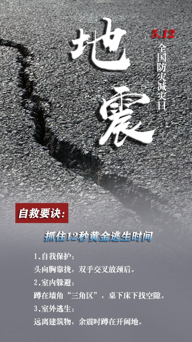 今天是第15個全國防災(zāi)減災(zāi)日。自然災(zāi)害隨時可能發(fā)生,及時自救才更有生存希望。地震來時,如何抓住12秒黃金逃生時間?發(fā)生火災(zāi)時,如何躲避火場濃煙?暴雨天如何安全出行?沙塵天氣如何做好防護……這份實用避險口訣簡單好記,請速速收藏。