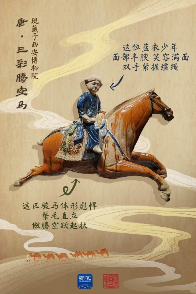 1000多年前,一位來(lái)自西域的“藍(lán)衣少年”,穿過(guò)茫茫戈壁、廣袤沙漠,抵達(dá)長(zhǎng)安。這位“藍(lán)衣少年”,是西安博物院“明星”藏品——唐代三彩騰空馬之上的騎手?!八保惨娮C了這場(chǎng)跨越千年的文明交融。