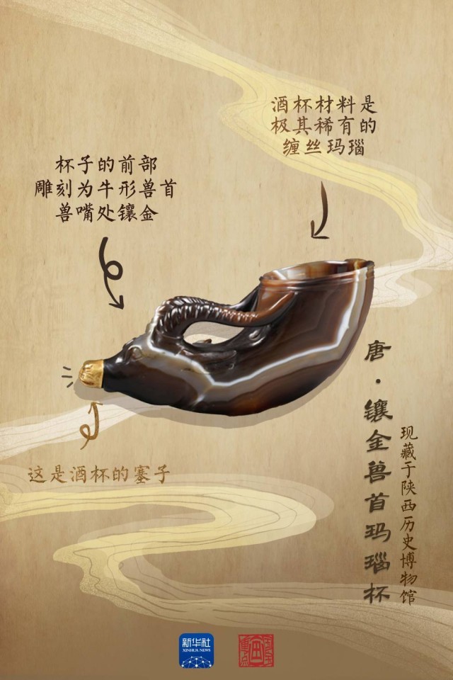 這件鑲金獸首瑪瑙杯,被列為我國(guó)禁止出境的珍貴文物之一。角狀杯體由一整塊極為罕見的紅色纏絲瑪瑙雕琢而成,整個(gè)杯體高6.5厘米,長(zhǎng)15.6厘米,口徑5.6厘米,其造型與起源于古希臘的酒具“來(lái)通”相似,“來(lái)通”曾廣泛流行于中亞、西亞地區(qū),沿著絲綢之路不斷東傳進(jìn)入中國(guó)。