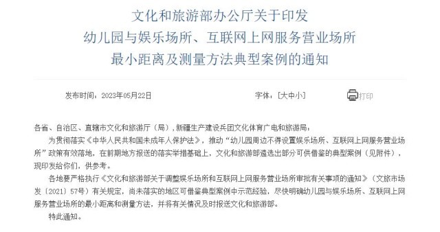 為貫徹落實(shí)《中華人民共和國(guó)未成年人保護(hù)法》,推動(dòng)“幼兒園周邊不得設(shè)置娛樂場(chǎng)所、互聯(lián)網(wǎng)上網(wǎng)服務(wù)營(yíng)業(yè)場(chǎng)所”政策有效落地,在前期地方報(bào)送的落實(shí)舉措基礎(chǔ)上,文化和旅游部遴選出部分可供借鑒的典型案例(見附件),現(xiàn)印發(fā)給你們,供參考。