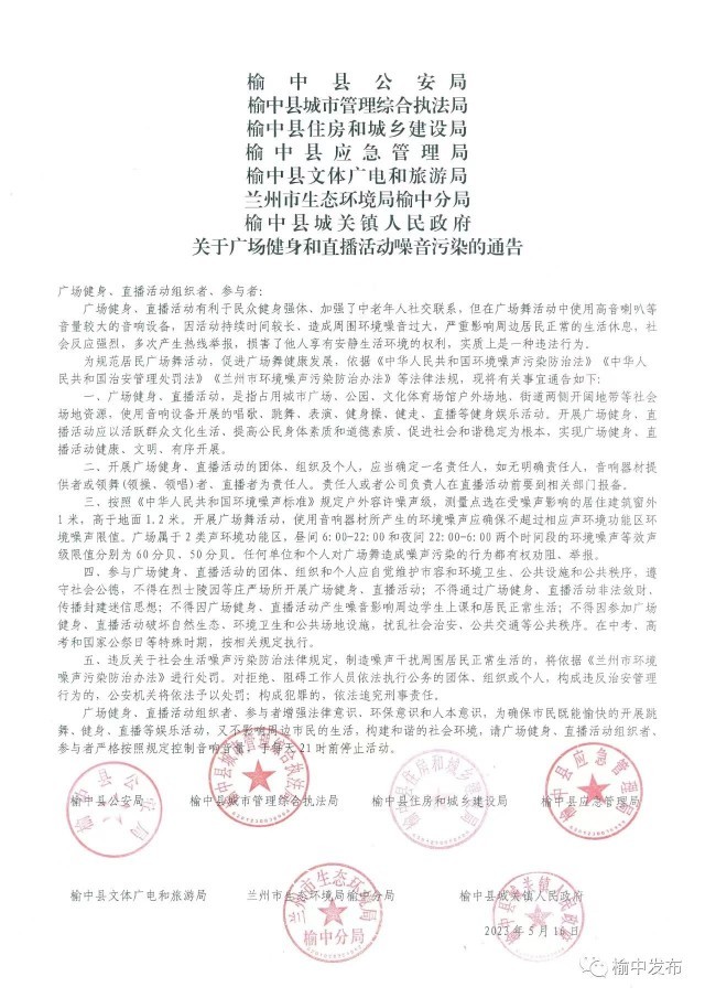 日前,蘭州市榆中縣公安局、榆中縣城市管理綜合執(zhí)法局等單位聯(lián)合發(fā)布《關(guān)于廣場健身和直播活動噪音污染的通告》(以下簡稱《通告》),其中明確,當(dāng)?shù)貜V場健身、直播活動組織者參與者嚴(yán)格按照規(guī)定控制音響音量,于每天21時前停止活動。