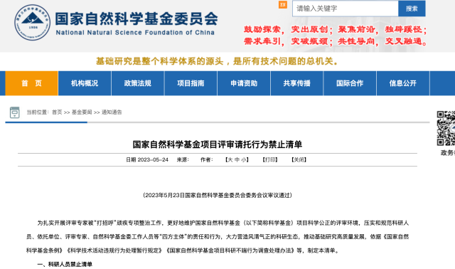 5月24日,國家自然科學基金委(以下簡稱自然科學基金委)發(fā)布《國家自然科學基金項目評審請托行為禁止清單》,集中對科研人員、依托單位、評審專家、自然科學基金委工作人員等“四方主體”明確提出24項禁止行為。