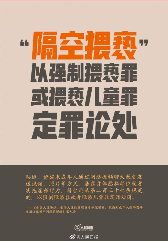 25日,兩高聯(lián)合發(fā)布司法解釋。其中,兩高對隔空猥褻發(fā)布司法解釋,以強制猥褻罪或猥褻兒童罪定罪論處;精神發(fā)育遲滯未成年懷孕可直接立案…戳↓↓每一個孩子都要健康快樂成長!