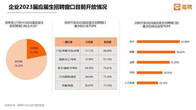 中國青年報(bào)客戶端訊(中青報(bào)·中青網(wǎng)記者 朱彩云)臨近畢業(yè)季,獵聘大數(shù)據(jù)研究院日前推出的《2023屆高校畢業(yè)生就業(yè)數(shù)據(jù)報(bào)告》顯示,目前有78.22%的企業(yè)仍開放校招窗口,其中廣告/傳媒/文化/教育、能源/化工/環(huán)保行業(yè)的企業(yè)占比分別達(dá)88.89%、87.1%。在招崗位中,技術(shù)、銷售和運(yùn)營類需求量位居前三。