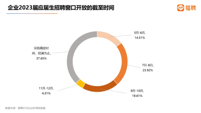 據(jù)了解,2023屆高校畢業(yè)生規(guī)模預(yù)計(jì)1158萬人,同比增加82萬人。本次調(diào)研中,有37.65%的企業(yè)表示校招窗口期“沒有確定截止時(shí)間,招滿為止”,23.92%的企業(yè)表示“最晚到7-8月”,19.61%的企業(yè)把期限定為9-10月。