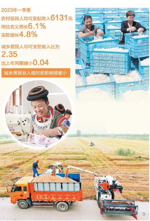 國(guó)家統(tǒng)計(jì)局發(fā)布的數(shù)據(jù)顯示,去年農(nóng)村居民人均可支配收入首次邁上2萬(wàn)元這個(gè)新臺(tái)階,城鄉(xiāng)居民收入相對(duì)差距持續(xù)縮小。今年一季度,農(nóng)村居民人均可支配收入繼續(xù)保持增長(zhǎng)勢(shì)頭,同比名義增長(zhǎng)6.1%,實(shí)際增長(zhǎng)4.8%,比去年全年提高0.6個(gè)百分點(diǎn)。