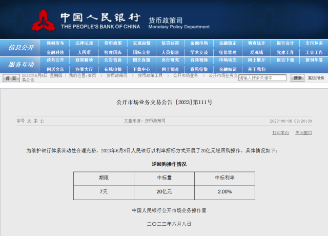 據(jù)央行官網(wǎng)消息,為維護(hù)銀行體系流動(dòng)性合理充裕,2023年6月8日中國(guó)人民銀行以利率招標(biāo)方式開展了20億元逆回購(gòu)操作。具體情況如下: