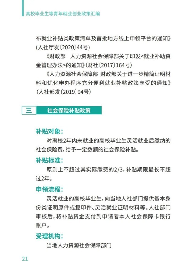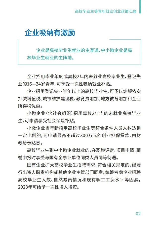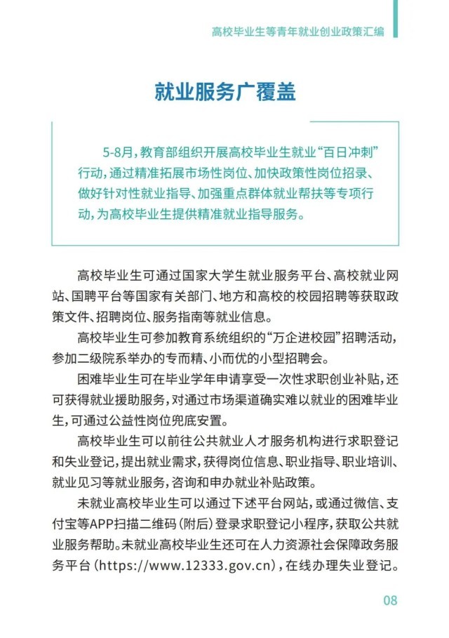 《匯編》系統(tǒng)梳理了國(guó)家有關(guān)部門出臺(tái)的促進(jìn)高校畢業(yè)生就業(yè)創(chuàng)業(yè)現(xiàn)行政策,聚焦高校畢業(yè)生求職就業(yè)需求,分為企業(yè)就業(yè)、基層就業(yè)、自主創(chuàng)業(yè)、能力提升、應(yīng)征入伍、就業(yè)見習(xí)、就業(yè)服務(wù)、就業(yè)手續(xù)、權(quán)益維護(hù)等九方面內(nèi)容。為便于高校畢業(yè)生和企業(yè)快速查閱相關(guān)政策,《匯編》還歸納整理了就業(yè)有關(guān)政策清單,包括6項(xiàng)面向企業(yè)(單位)吸納高校畢業(yè)生就業(yè)的補(bǔ)貼、稅收優(yōu)惠等政策,以及9項(xiàng)面向高校畢業(yè)生的補(bǔ)貼、資助等政策。