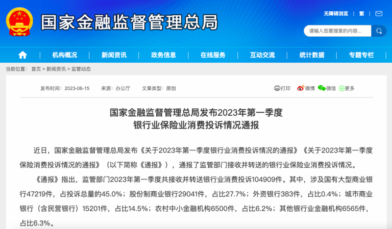 近日,國家金融監(jiān)督管理總局發(fā)布《關(guān)于2023年第一季度銀行業(yè)消費(fèi)投訴情況的通報(bào)》《關(guān)于2023年第一季度保險(xiǎn)消費(fèi)投訴情況的通報(bào)》(以下簡稱《通報(bào)》),通報(bào)了監(jiān)管部門接收并轉(zhuǎn)送的銀行業(yè)保險(xiǎn)業(yè)消費(fèi)投訴情況。