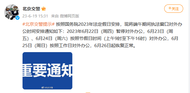 央視網(wǎng)消息:據(jù)北京交警微博消息,按照國務(wù)院2023年法定假日安排,現(xiàn)將端午期間執(zhí)法窗口對(duì)外辦公時(shí)間安排通知如下:2023年6月22日(周四)暫停對(duì)外辦公,6月23日(周五)、6月24日(周六)按照節(jié)假日時(shí)間(上午9時(shí)至下午16時(shí))對(duì)外辦公,6月25日(周日)按照工作日對(duì)外辦公,6月26日起恢復(fù)正常。