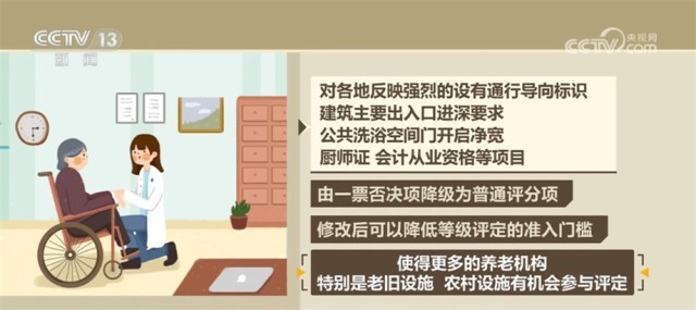 此次發(fā)布的指南包括環(huán)境、設施設備、運營管理、服務等多項內(nèi)容,與2020年發(fā)布的《<養(yǎng)老機構等級劃分與評定>國家標準實施指南》(試行)相比,在框架、體例整體保持一致的前提下,刪除了一些可操作性不強以及非養(yǎng)老機構必備的條件,對各地反映強烈的設有通行導向標識、建筑主要出入口進深要求、公共洗浴空間門開啟凈寬、廚師證、會計從業(yè)資格等項目,由一票否決項降級為普通評分項,修改后可以降低等級評定的準入門檻,使得更多的養(yǎng)老機構特別是老舊設施、農(nóng)村設施有機會參與評定。