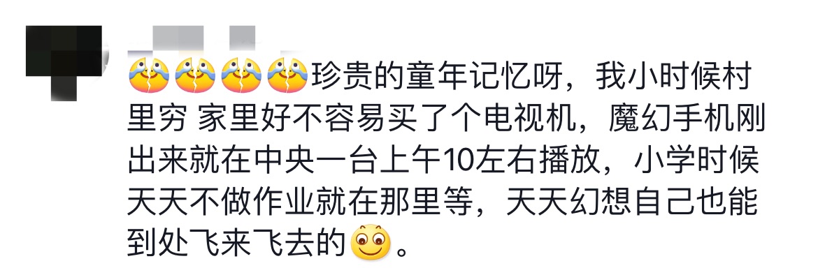 一名網(wǎng)友稱《魔幻手機》是自己珍貴的童年記憶,當年家里好不容易買了電視機,小學時天天守在電視機前等待播出,“天天幻想自己也能到處飛來飛去”。