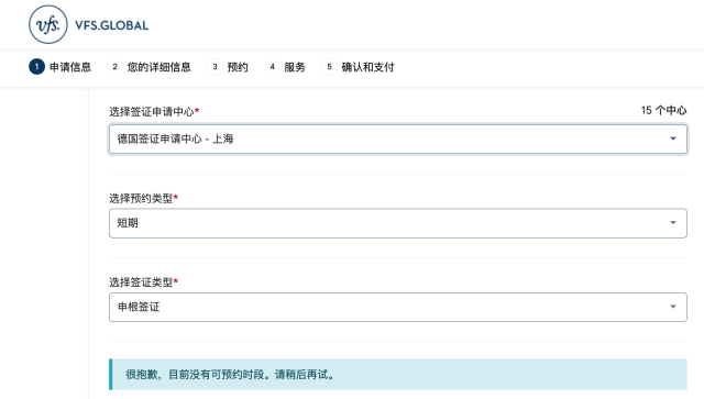 如在威孚仕官網(wǎng),在國(guó)內(nèi)多個(gè)城市的德國(guó)簽證申請(qǐng)中心申請(qǐng)短期申根簽證都顯示“目前沒有可預(yù)約時(shí)段”。