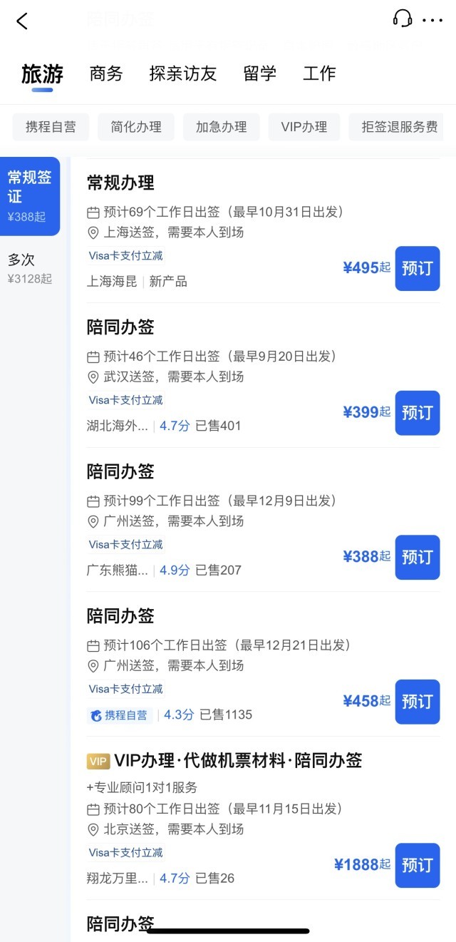 而在在線旅游平臺(tái),以法國(guó)簽證為例,上海地區(qū)送簽常規(guī)辦理顯示最早10月31日出發(fā)。武漢送簽顯示最早9月20日出發(fā)。而廣州送簽則顯示最早出發(fā)時(shí)間在12月。