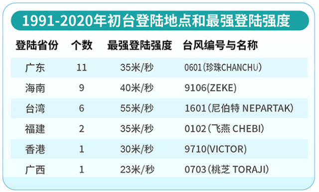 預(yù)計,臺風(fēng)“泰利”將在廣東陽江到海南文昌一帶沿海登陸,那么常年初臺更“青睞”在哪里“上岸”呢?通過常年統(tǒng)計數(shù)據(jù)我們可以看到,初臺一般在華南等低緯度沿海地區(qū)登陸,初臺最常登陸地為廣東?。?1個)、海南省(9個)和臺灣?。?個)。