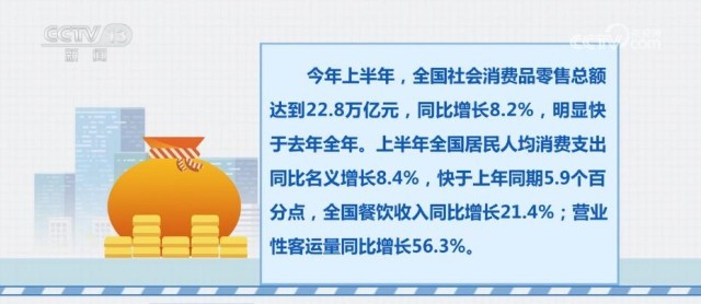 今年上半年,全國社會消費(fèi)品零售總額達(dá)到22.8萬億元,同比增長8.2%,明顯快于去年全年。上半年全國居民人均消費(fèi)支出同比名義增長8.4%,快于上年同期5.9個(gè)百分點(diǎn),全國餐飲收入同比增長21.4%;營業(yè)性客運(yùn)量同比增長56.3%。