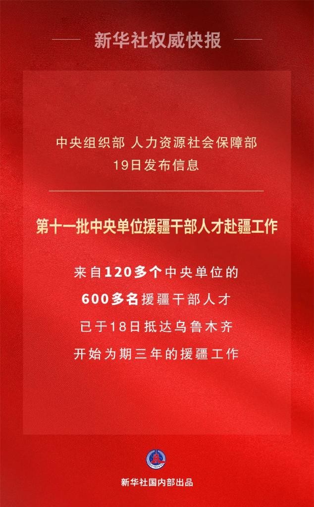 7月18日,中央組織部、人力資源社會保障部有關(guān)負(fù)責(zé)同志帶隊,送第十一批中央單位援疆干部人才抵達烏魯木齊,開始了為期三年的援疆工作。