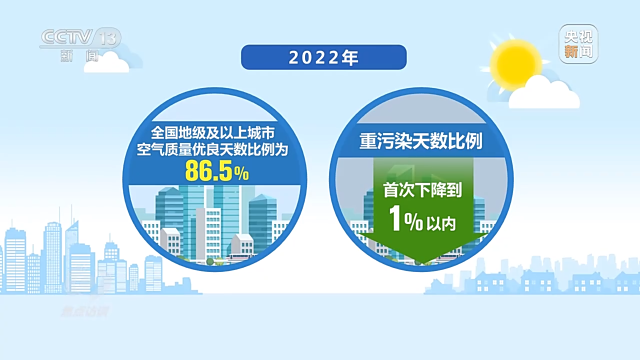 不僅北京,十年來(lái),全國(guó)重點(diǎn)城市PM2.5平均濃度下降57%。2022年,全國(guó)地級(jí)及以上城市空氣質(zhì)量?jī)?yōu)良天數(shù)比例為86.5%,重污染天數(shù)比例首次下降到1%以?xún)?nèi)。我國(guó)成為全球大氣質(zhì)量改善速度最快的國(guó)家,藍(lán)天保衛(wèi)戰(zhàn)正在給百姓帶來(lái)實(shí)實(shí)在在的幸福感。