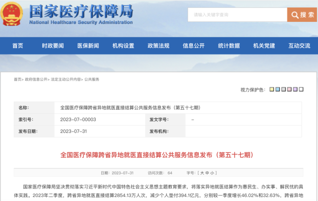此外,住院費用跨省直接結算規(guī)模進一步增長。截至2023年二季度末,全國住院費用跨省聯網定點醫(yī)療機構達7.44萬家,較一季度末增長0.69萬家。2023年二季度,住院費用跨省直接結算282.57萬人次。