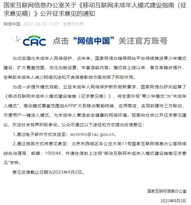 國家互聯網信息辦公室關于《移動互聯網未成年人模式建設指南(征求意見稿)》公開征求意見的通知