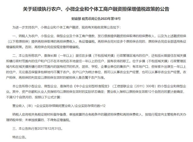 兩部門:延續(xù)執(zhí)行農(nóng)戶、小微企業(yè)和個體工商戶融資擔(dān)保增值稅政策