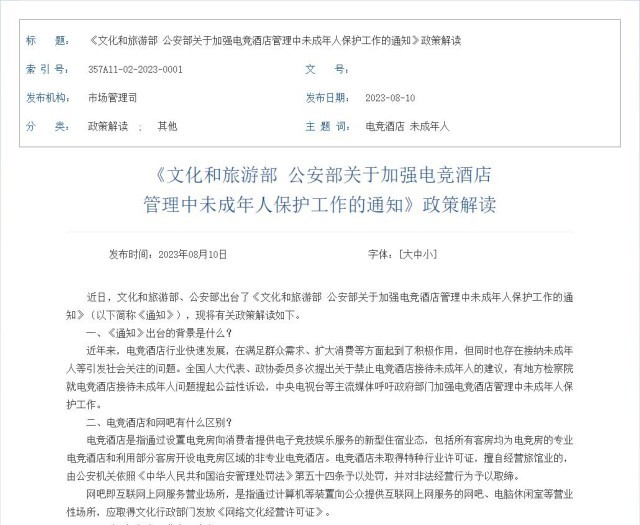 《文化和旅游部 公安部關(guān)于加強(qiáng)電競酒店管理中未成年人保護(hù)工作的通知》政策解讀