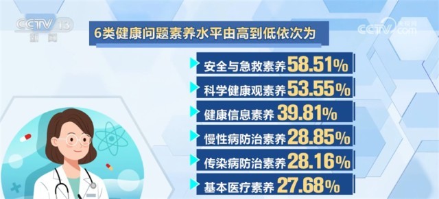6類健康問(wèn)題素養(yǎng)水平由高到低依次為:安全與急救素養(yǎng)58.51%、科學(xué)健康觀素養(yǎng)53.55%、健康信息素養(yǎng)39.81%、慢性病防治素養(yǎng)28.85%、傳染病防治素養(yǎng)28.16%和基本醫(yī)療素養(yǎng)27.68%。各類健康問(wèn)題素養(yǎng)均有不同程度提升,其中,健康信息素養(yǎng)水平增幅最大,較2021年提升了3.88個(gè)百分點(diǎn)。本次監(jiān)測(cè)覆蓋31個(gè)?。ㄗ灾螀^(qū)、直轄市)的336個(gè)縣(區(qū))1008個(gè)鄉(xiāng)鎮(zhèn)(街道),對(duì)象為15—69歲常住人口。