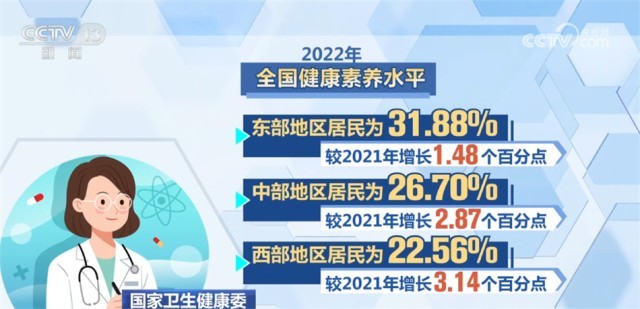 監(jiān)測(cè)結(jié)果顯示,2022年,全國(guó)城市居民健康素養(yǎng)水平為31.94%,農(nóng)村居民為23.78%,較2021年分別增長(zhǎng)1.24和1.76個(gè)百分點(diǎn)。東、中、西部地區(qū)居民健康素養(yǎng)水平分別為31.88%、26.70%和22.56%,較2021年分別增長(zhǎng)1.48、2.87和3.14個(gè)百分點(diǎn)。城鄉(xiāng)居民基本知識(shí)和理念素養(yǎng)水平為41.26%,健康生活方式與行為素養(yǎng)水平為30.63%,基本技能素養(yǎng)水平為26.00%,較2021年分別提升3.60、2.58、1.72個(gè)百分點(diǎn)。