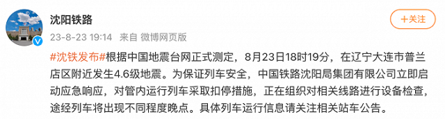 央視網(wǎng)消息:據(jù)@沈陽鐵路 微博消息,根據(jù)中國地震臺網(wǎng)正式測定,8月23日18時19分,在遼寧大連市普蘭店區(qū)附近發(fā)生4.6級地震。為保證列車安全,中國鐵路沈陽局集團有限公司立即啟動應急響應,對管內(nèi)運行列車采取扣停措施,正在組織對相關線路進行設備檢查,途經(jīng)列車將出現(xiàn)不同程度晚點。具體列車運行信息請關注相關站車公告。