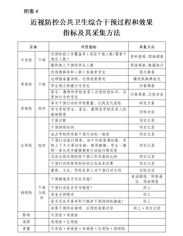 2.注重過(guò)程與效果評(píng)價(jià)。各級(jí)疾控機(jī)構(gòu)要定期開(kāi)展學(xué)生視力監(jiān)測(cè)工作,深入分析歷年監(jiān)測(cè)數(shù)據(jù),將監(jiān)測(cè)發(fā)現(xiàn)的主要學(xué)生健康問(wèn)題和建議及時(shí)報(bào)告當(dāng)?shù)卣?。基于?shí)施性研究方法,從理論向?qū)嵺`進(jìn)行轉(zhuǎn)化和應(yīng)用,可推進(jìn)干預(yù)行動(dòng)的實(shí)施與傳播。進(jìn)行過(guò)程與效果評(píng)價(jià),引入實(shí)施性研究框架和理論模型,如近視防控公共衛(wèi)生綜合干預(yù)過(guò)程和效果指標(biāo)及其采集方法(附表4),從個(gè)體層面和組織層面全面評(píng)價(jià)干預(yù)行動(dòng)的可及性、有效性、應(yīng)用性、可持續(xù)性,系統(tǒng)性地評(píng)估兒童青少年近視公共衛(wèi)生綜合干預(yù)的實(shí)施成效。