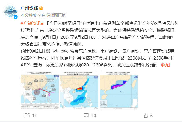 9月1日20時至9月2日18時,進(jìn)出廣東省列車全部停運