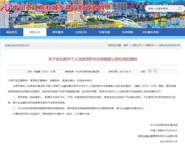 中新網(wǎng)8月31日電 據(jù)廣東省中山市住房和城鄉(xiāng)建設(shè)局網(wǎng)站消息,31日,中山市住房和城鄉(xiāng)建設(shè)局、中國人民銀行中山市分行、國家金融監(jiān)督管理總局中山監(jiān)管分局等三部門聯(lián)合發(fā)布《關(guān)于優(yōu)化我市個(gè)人住房貸款中住房套數(shù)認(rèn)定標(biāo)準(zhǔn)的通知》。通知提出,居民家庭(包括借款人、配偶及未成年子女,下同)申請貸款購買商品住房時(shí),家庭成員在當(dāng)?shù)孛聼o成套住房的,不論是否已利用貸款購買過住房,銀行業(yè)金融機(jī)構(gòu)均按首套住房執(zhí)行住房信貸政策。