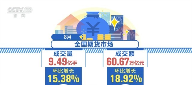 中國(guó)期貨業(yè)協(xié)會(huì)數(shù)據(jù)顯示,8月全國(guó)期貨市場(chǎng)成交量為9.49億手,成交額為60.67萬(wàn)億元,同比分別增長(zhǎng)47.76%和23.49%,環(huán)比分別增長(zhǎng)15.38%和18.92%。